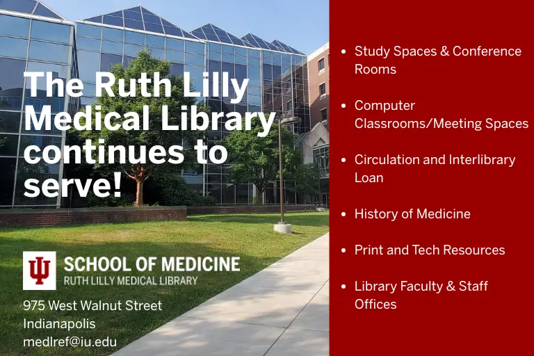 The Ruth Lilly Medical Library (RLML) main location at 975 W. Walnut St. will remain the main, full-service medical library in Indianapolis and is fully staffed during open hours, with helpful reference staff, reservable private study rooms, and plenty of beautiful study space. We encourage all new students to make the trip to visit us!